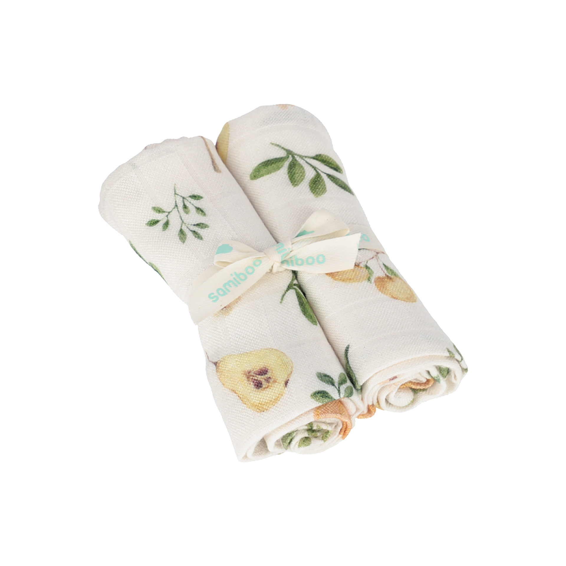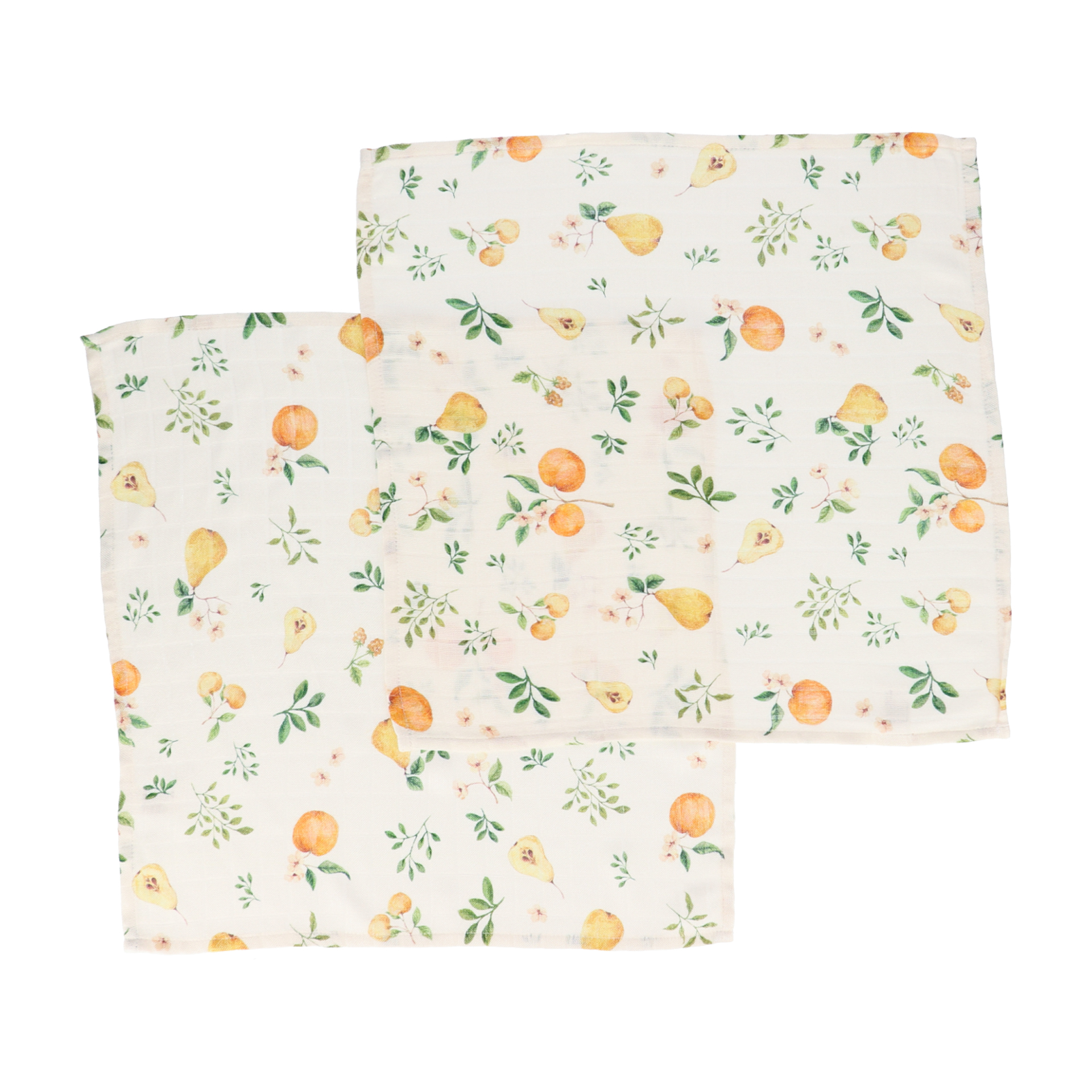 - Two premium muslin diapers, a 50x50 fruit pattern cm